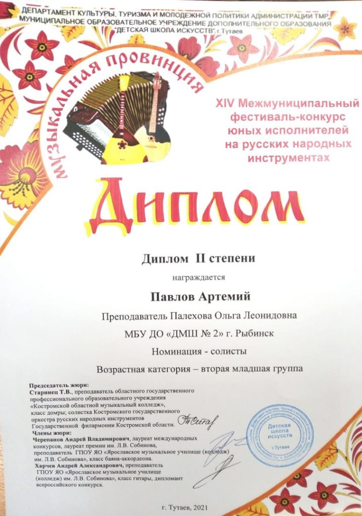 В ноябре 2021 состоялся уже традиционный XIV Межмуниципальный фестиваль-конкурс юных исполнителей на русских народных инструментах «Музыкальная провинция».
