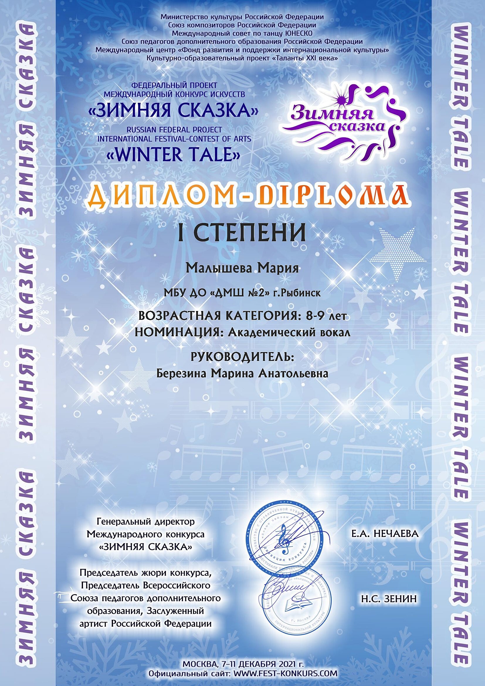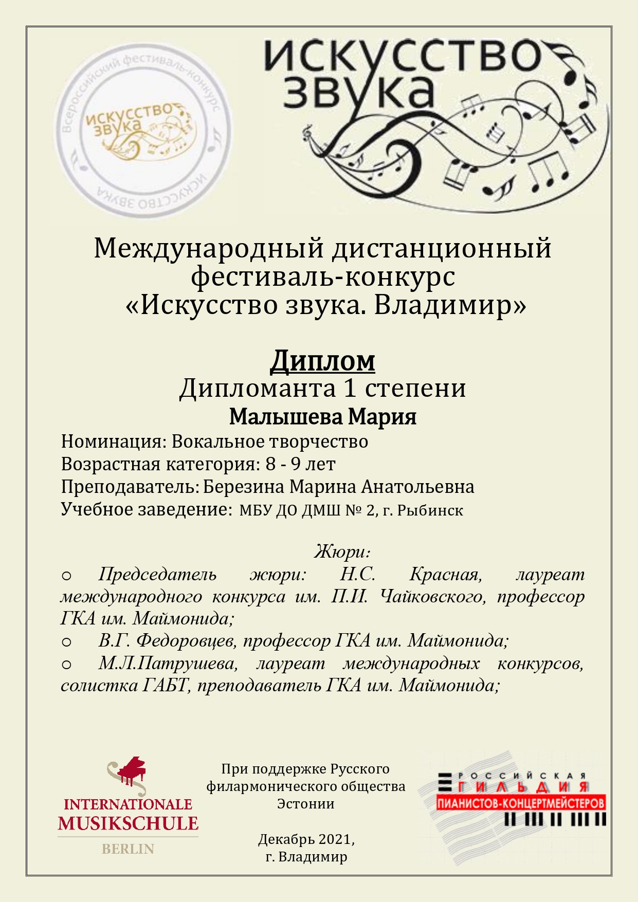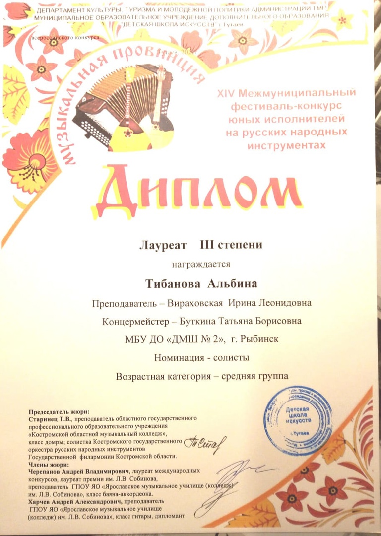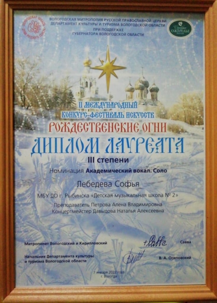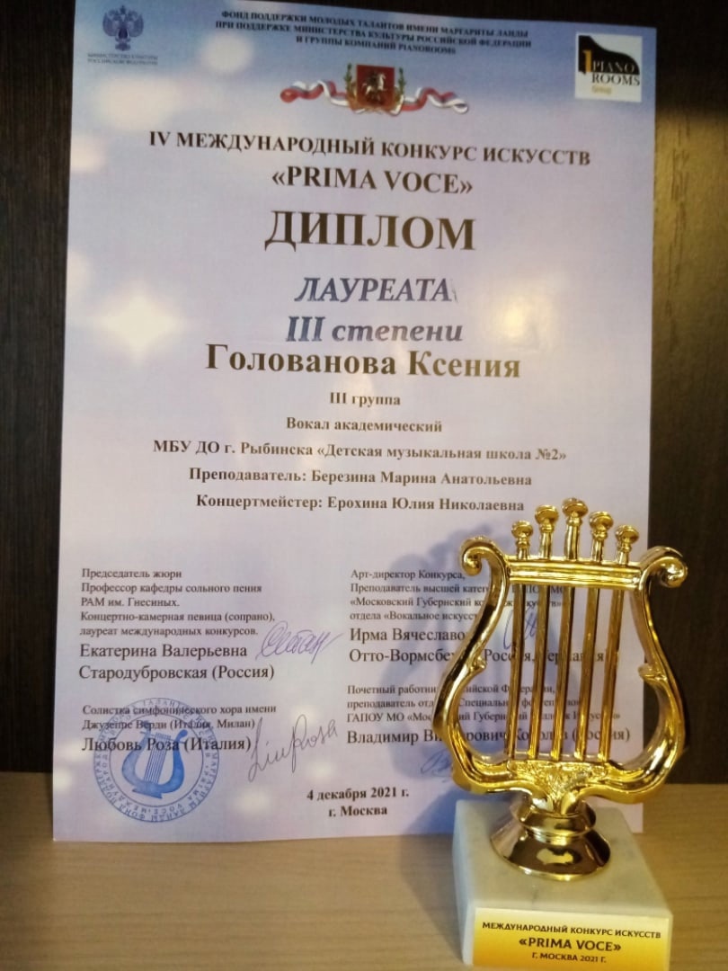 Мы с гордостью сообщаем, что наши учащиеся были высоко оценены жюри и получили высокие оценки своих конкурсных выступлений. От всей души поздравляем Тибанову Альбину (класс преподавателя Вираховской Ирины Леонидовны) с получением звания лауреата III степени! Павлова Артемия (класс преподавателя Палеховой Ольги Леонидовны) — дипломанта II степени! Желаем ребятам успехов и дальнейших творческих побед!