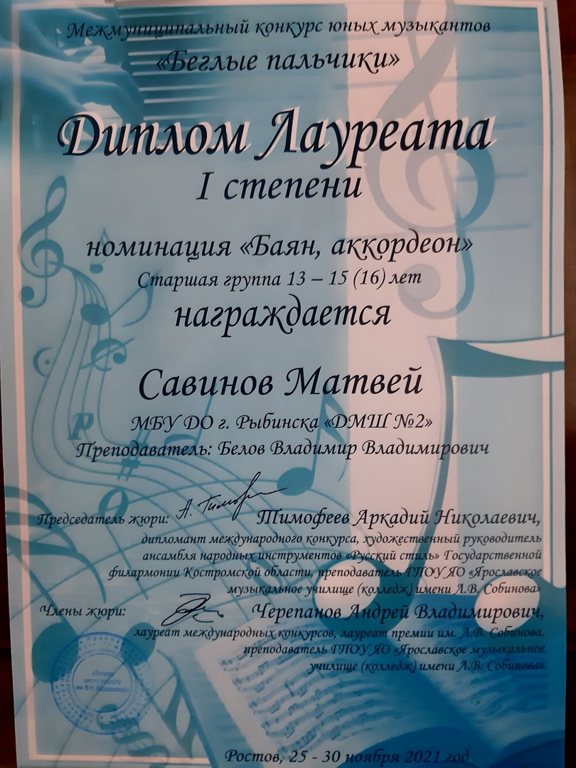 Мы спешим поделиться с нашими подписчиками радостной новостью: учащийся нашей школы Савинов Матвей (класс преподавателя Белова В. В.) получил на этом конкурсе звание Лауреата I степени!! Поздравляем Матвея и его преподавателя!!!