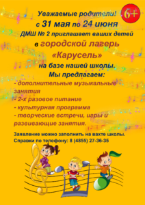 С 31 мая по 24 июня ДМШ №2 приглашает ваших детей в городской лагерь «Карусель» на базе нашей школы.