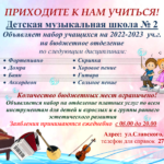 Детская музыкальная школа №2 объявляет набор учащихся на 2022-2023 уч.г. на бюджетное отделение по следующим отделениям: ФортепианоДомраБаянАккордеонСкрипкаХоровое пениеГитараСольное пение Заявки принимаются ежедневно с 08-00 до 20-00 Адрес: ул. Славского, д....